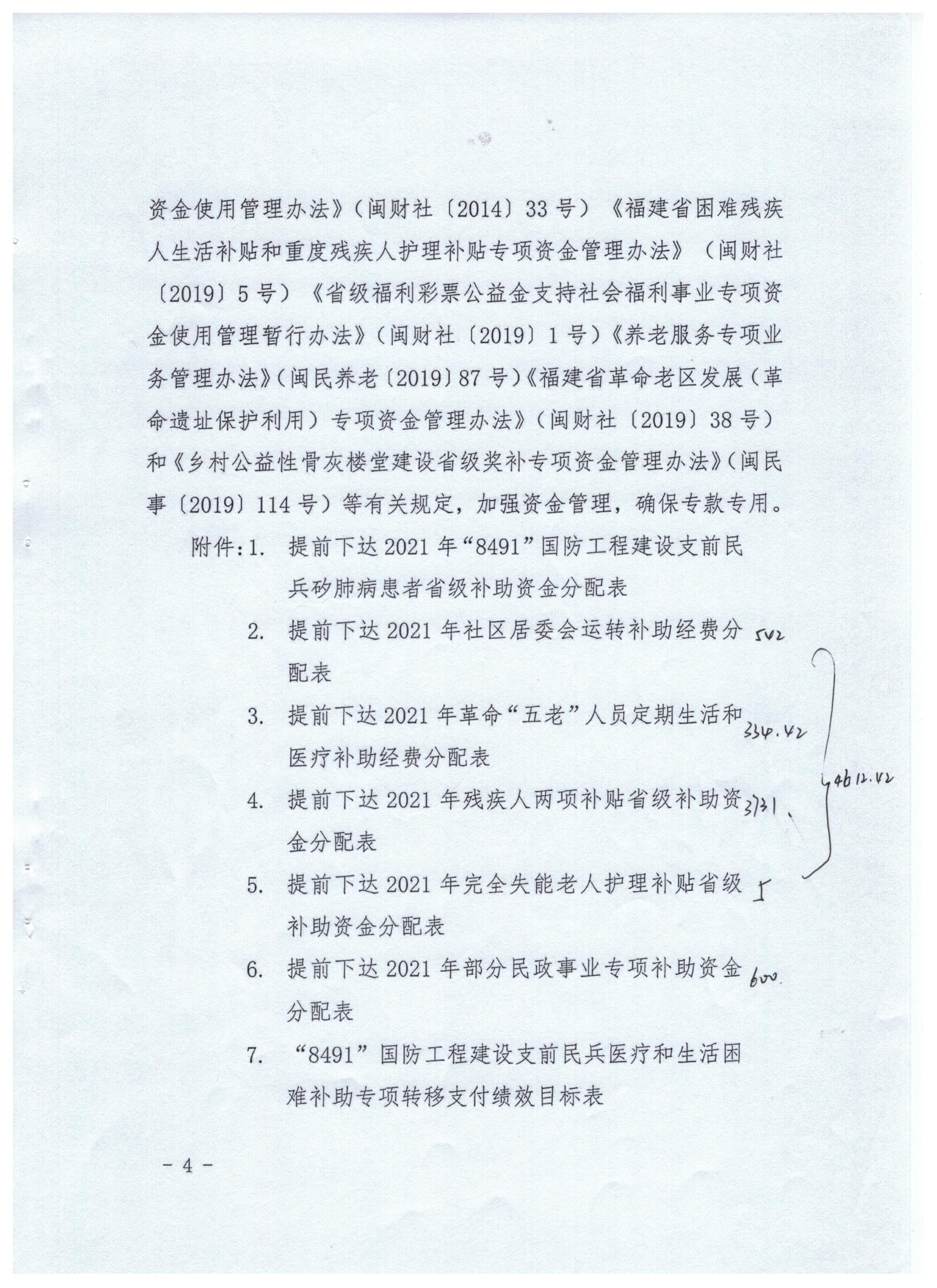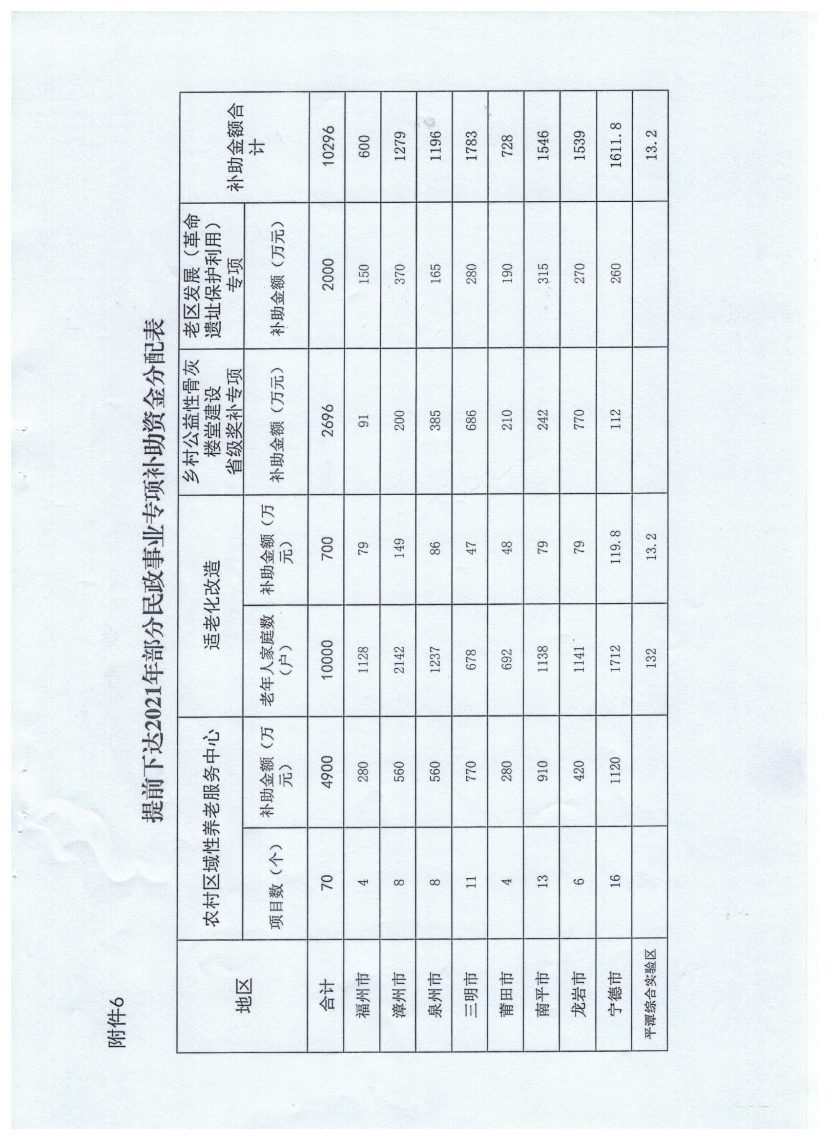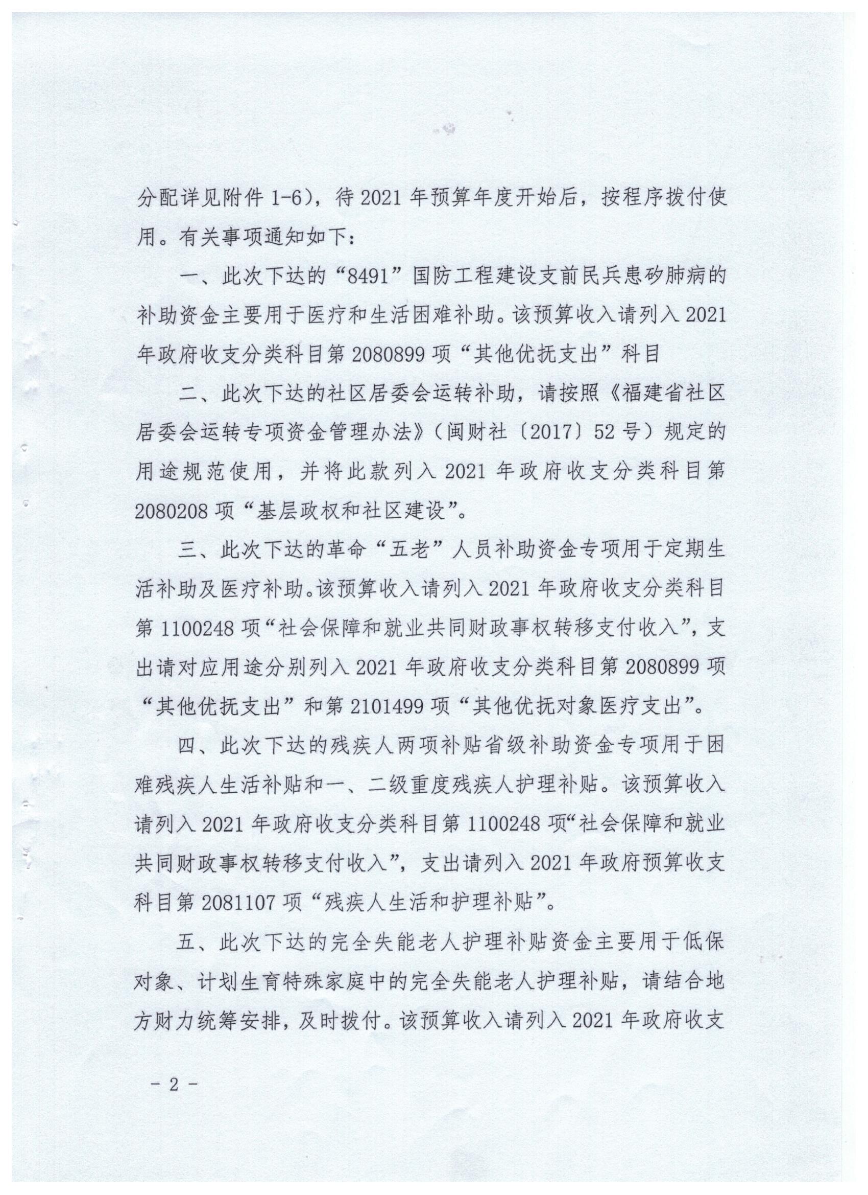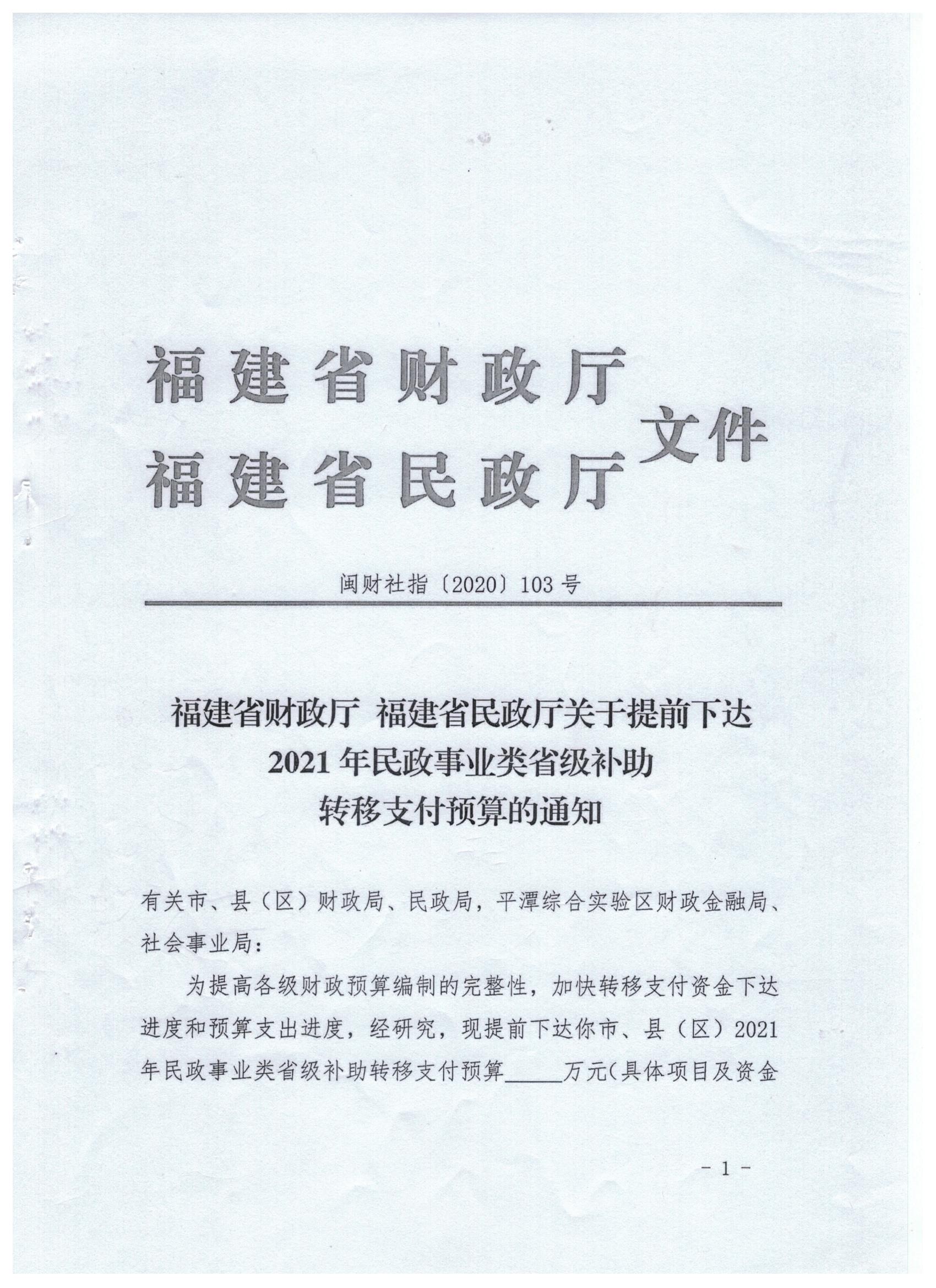 福建省财政厅 福建省民政厅关于提前下达2021年民政事业类省级补助转移支付预算的通知