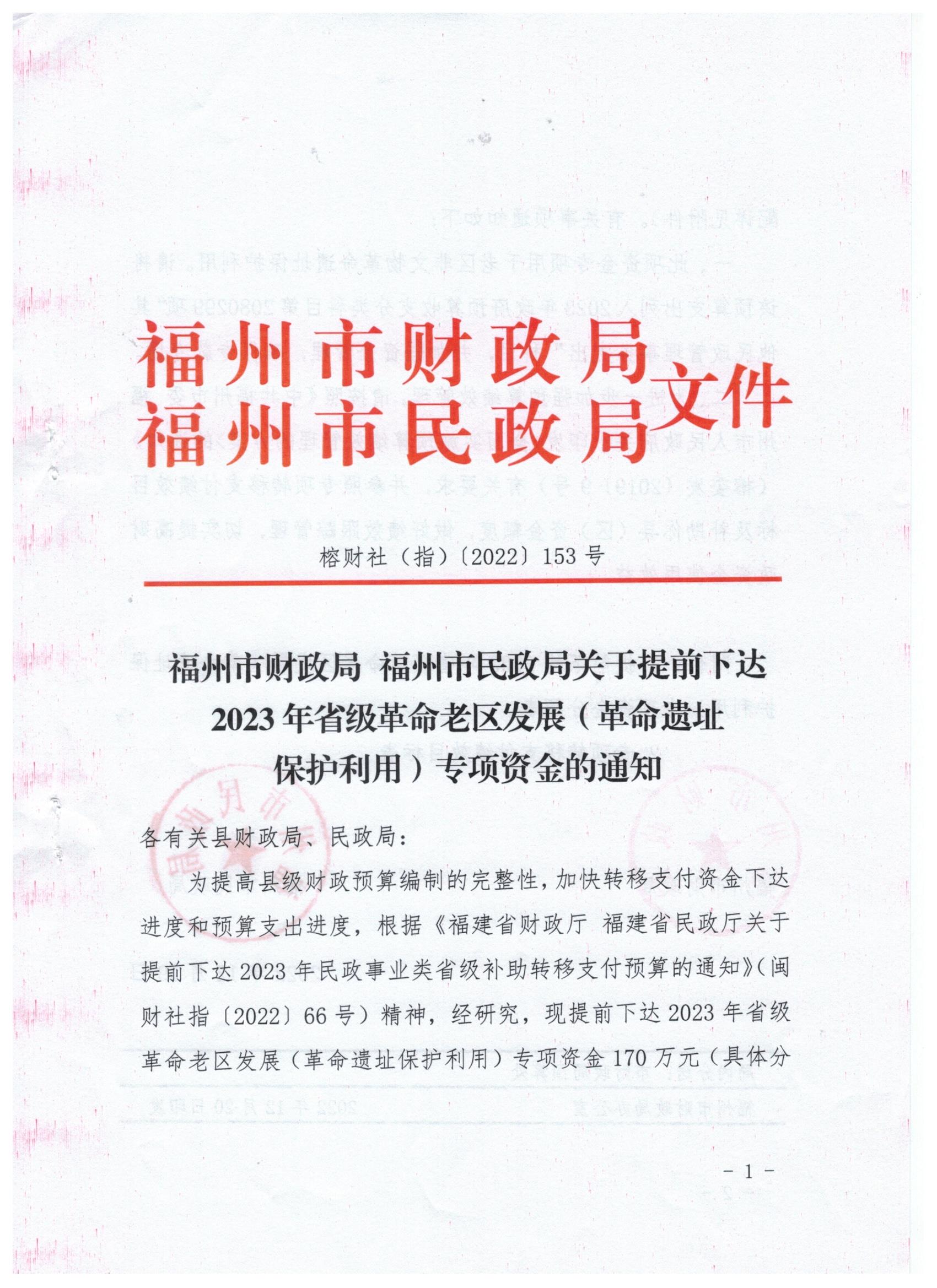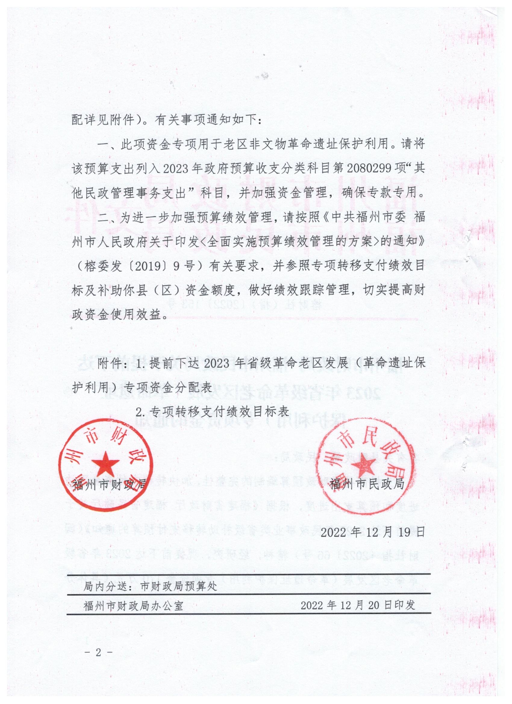 福州市财政局 西瓜视频 关于提前下达2023年省级革命老区(革命遗址保护利用)专项资金的通知