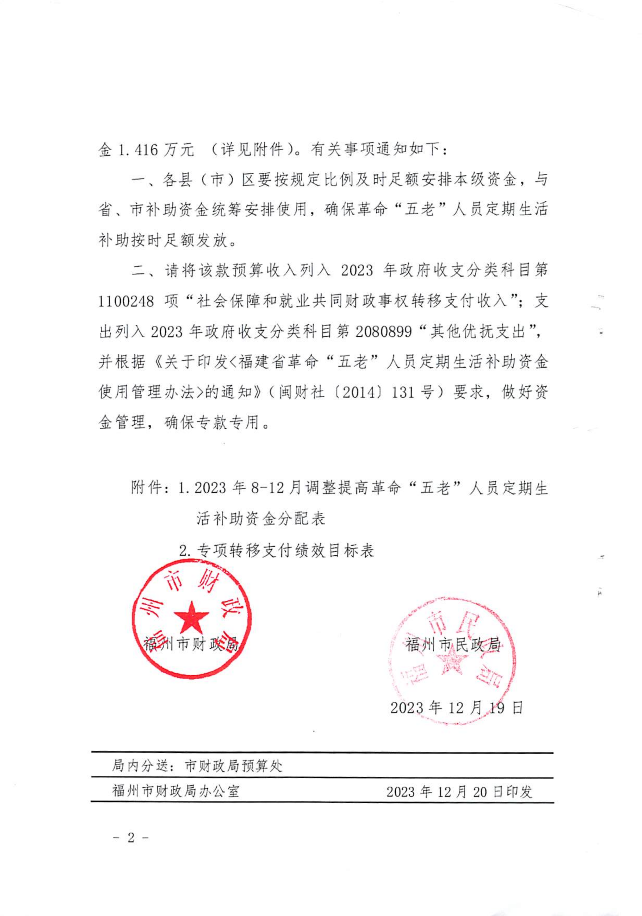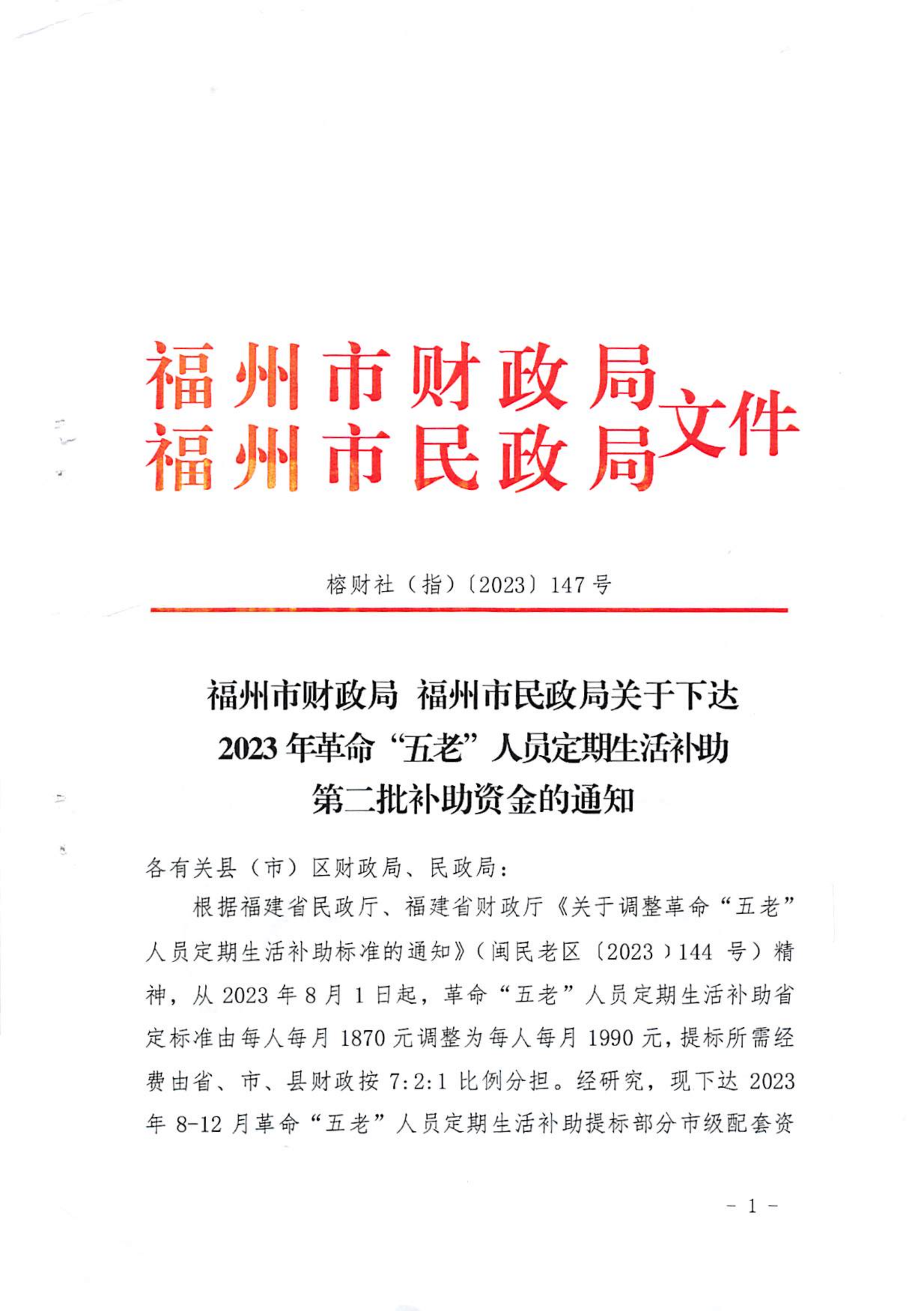 福州市财政局 西瓜视频 关于下达2023年革命“五老”人员定期生活补助第二批补助资金的通知