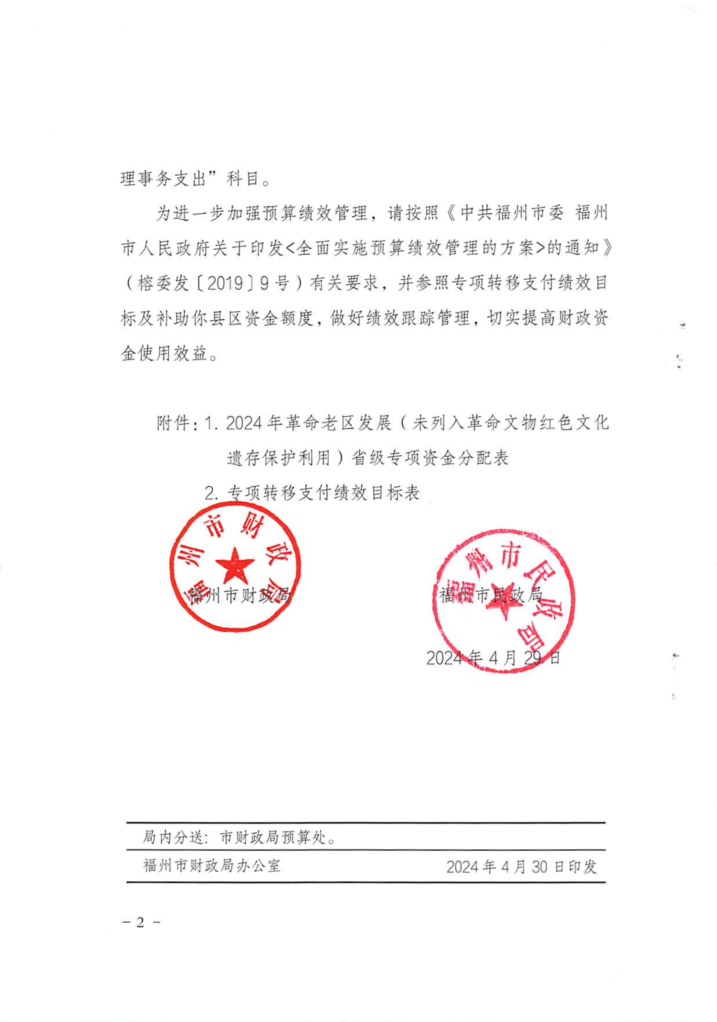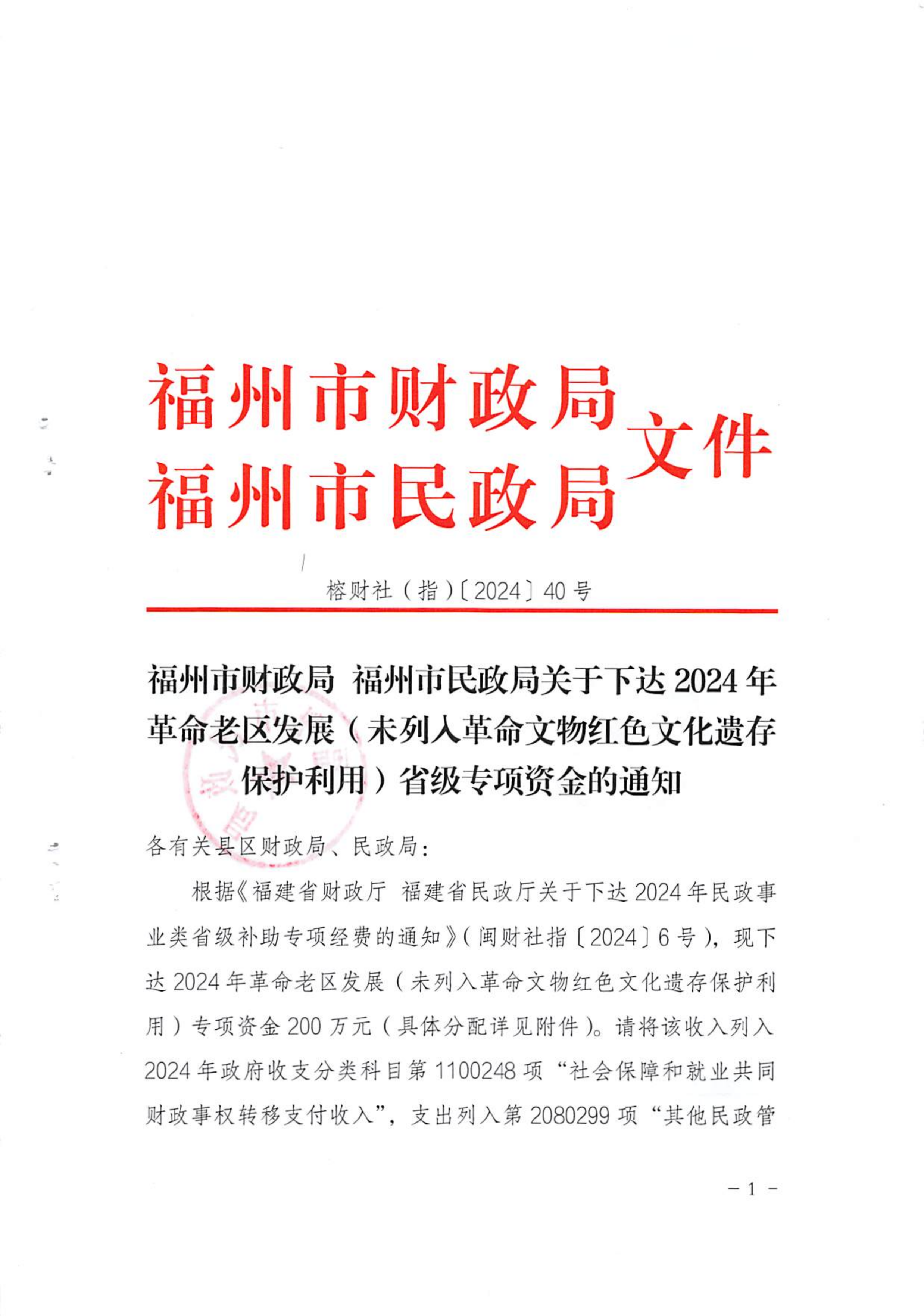 福州市财政局 西瓜视频 关于下达2024年革命老区发展(未列入革命文物红色文化遗存保护利用)省级专项资金的通知