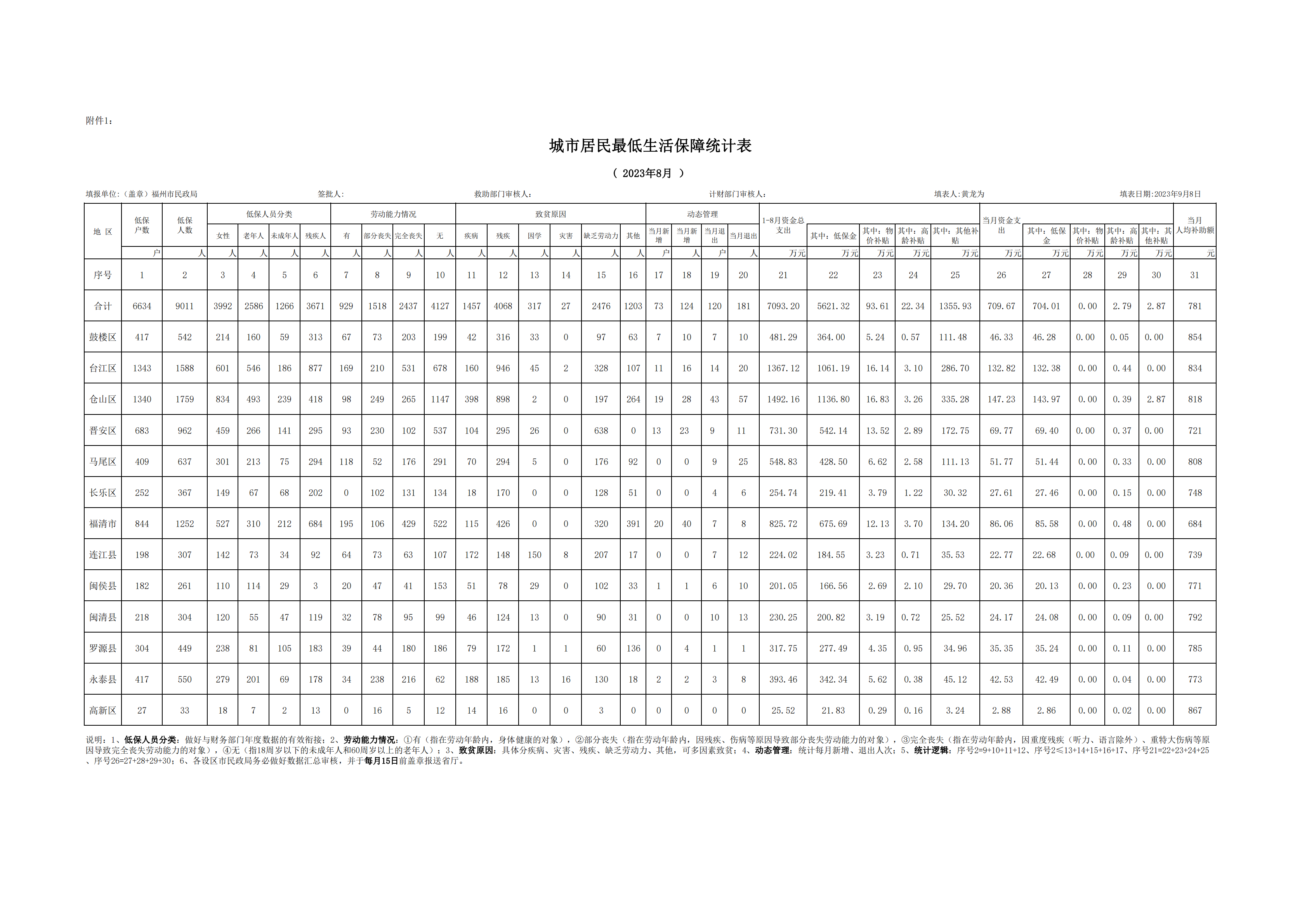 2023年福州市城市居民最低生活保障统计表(8月)