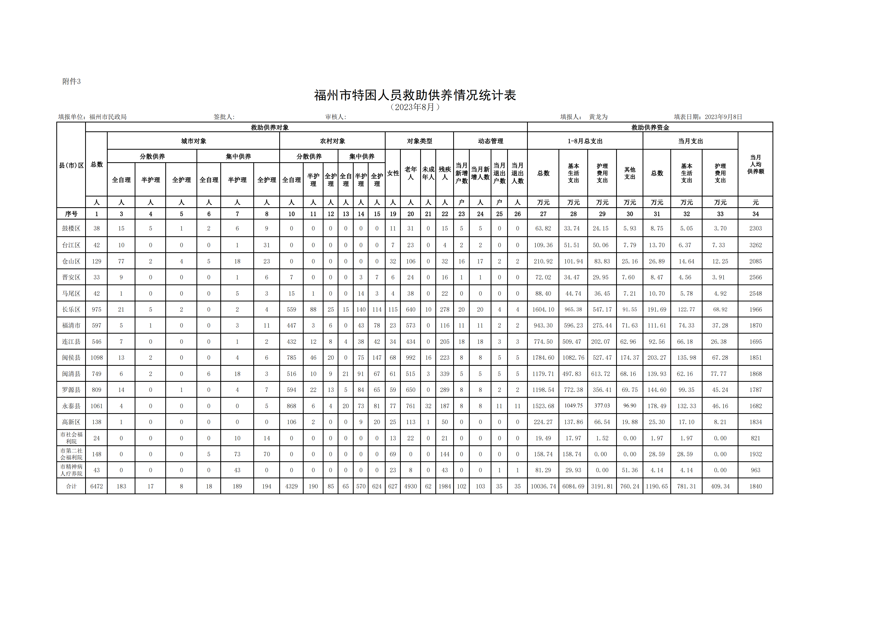 2023年福州市特困人员救助供养情况统计表(8月)