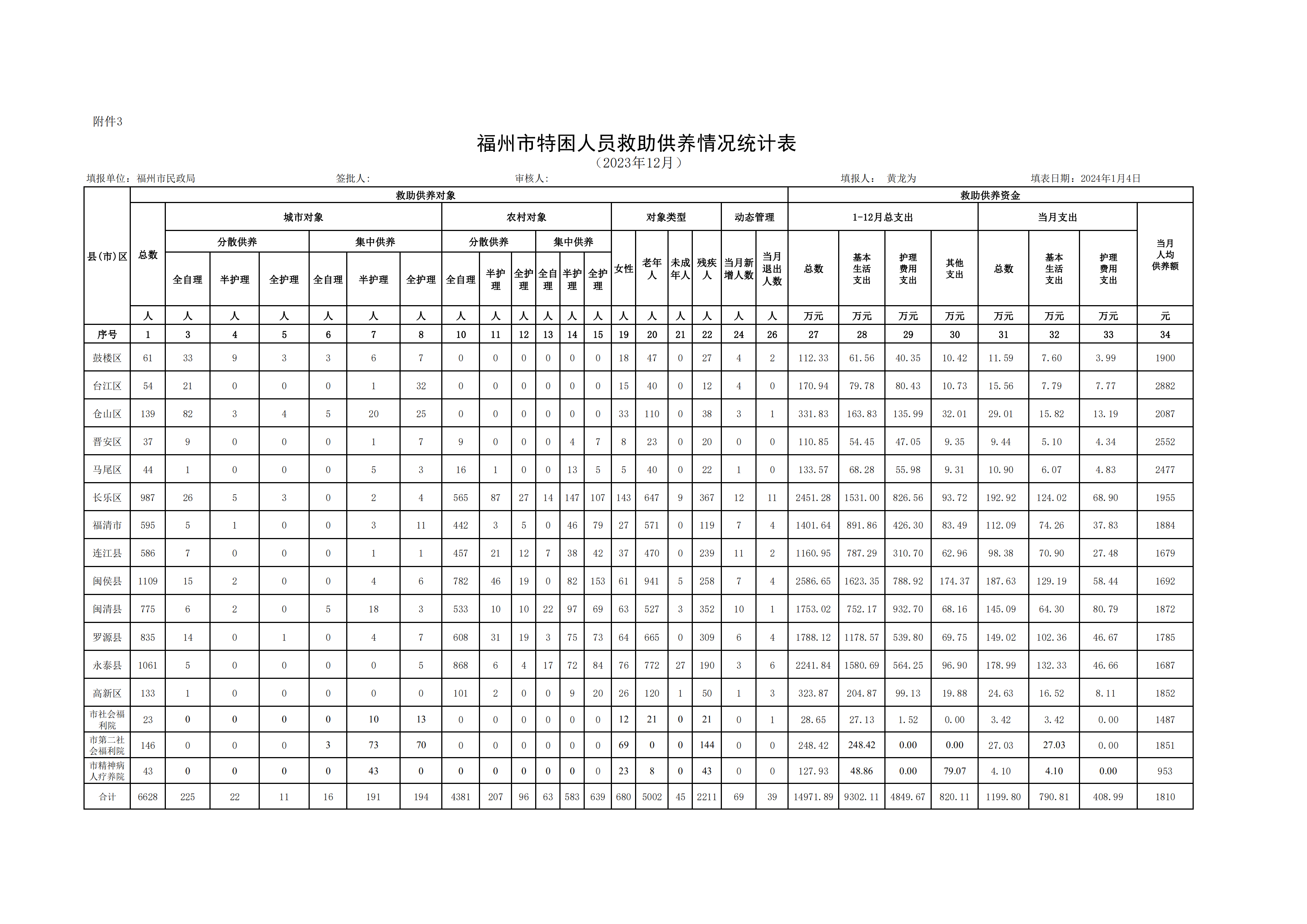 2023年福州市特困人员救助供养情况统计表(12月)