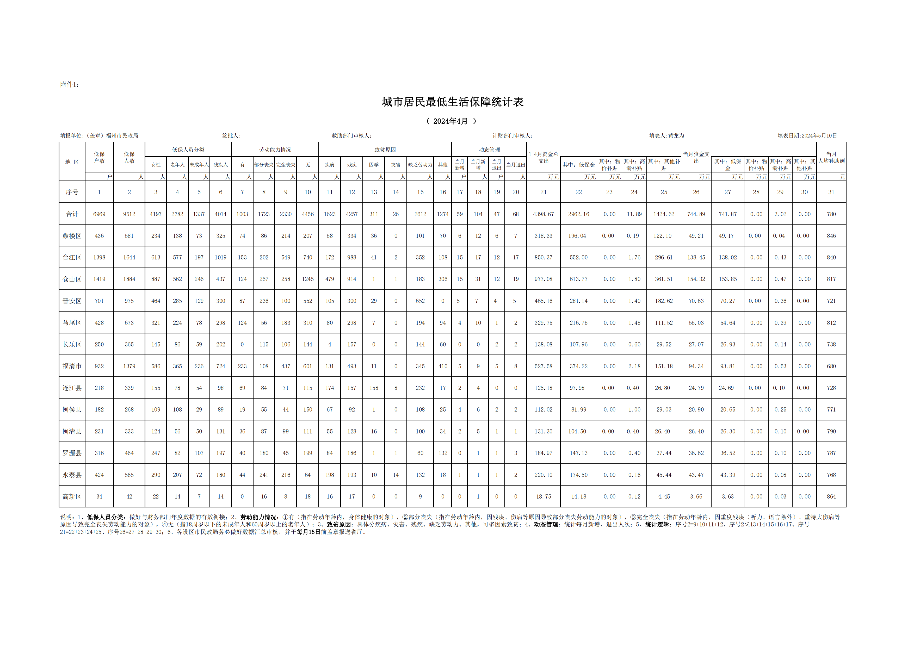 2024-04福州市城市居民最低生活保障统计表