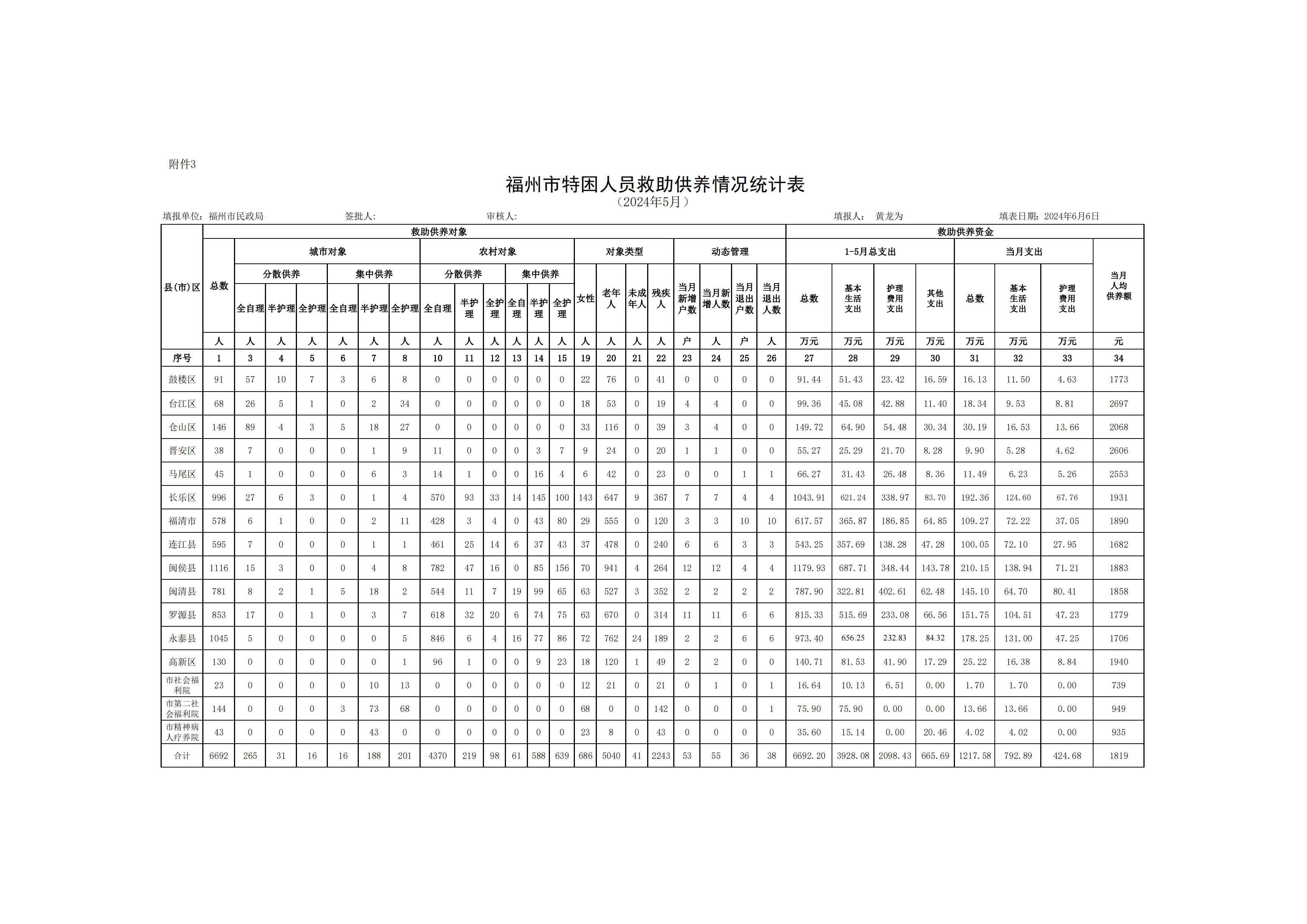 2024-05福州市特困人员救助供养情况统计表