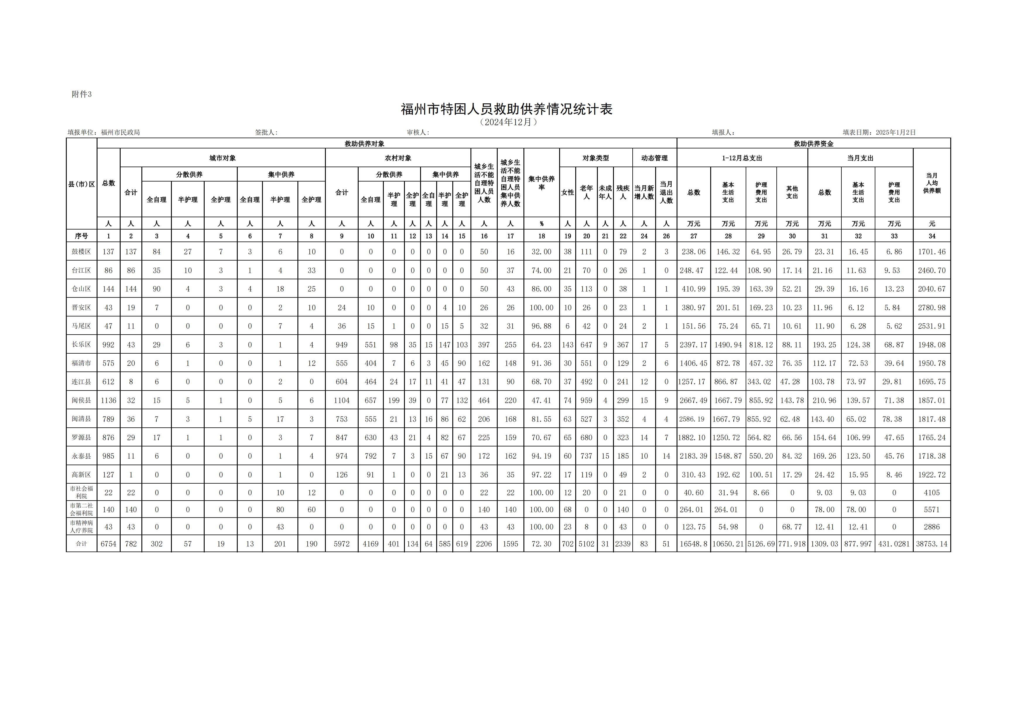 2024-12福州市特困人员救助供养情况统计表