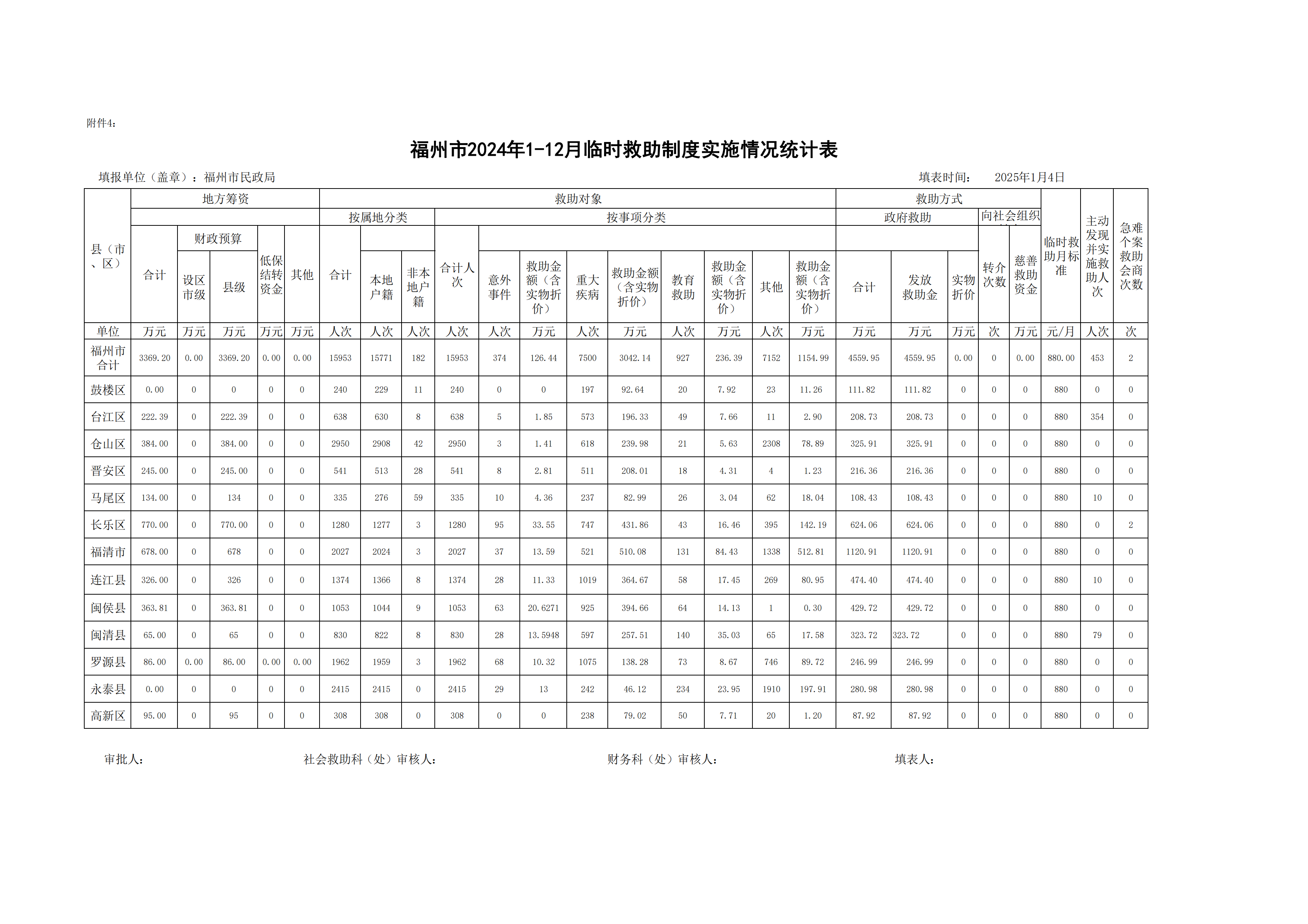 2024年第四季度福州市临时救助实施情况统计表