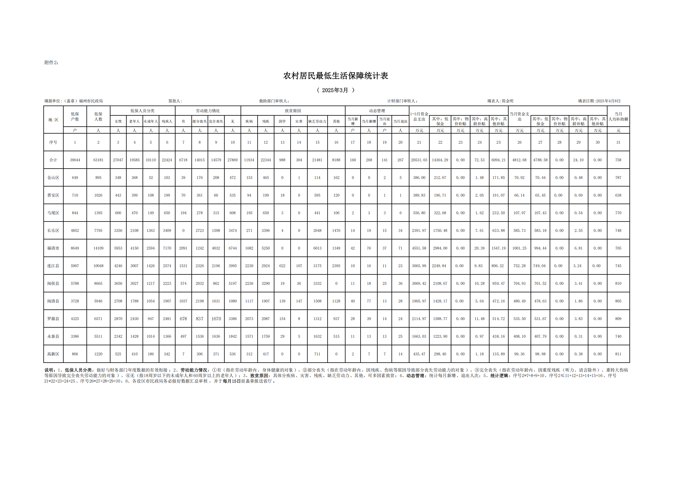 2025-3福州市农村居民最低生活保障统计表