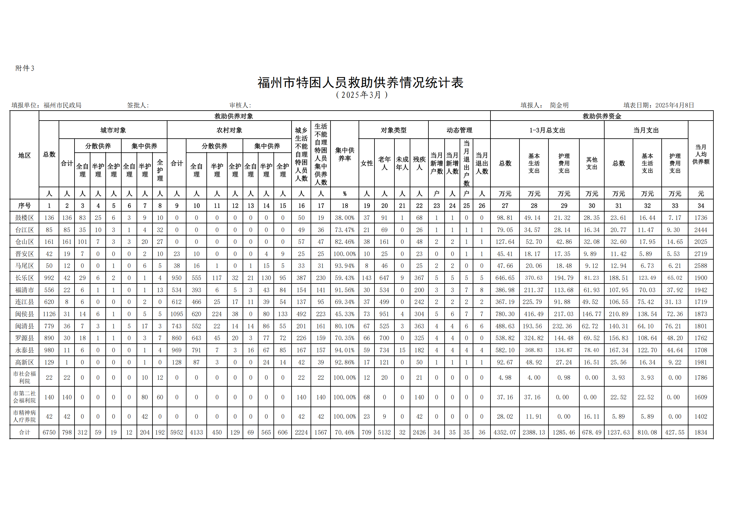 2025-3福州特困人员救助供养情况统计表