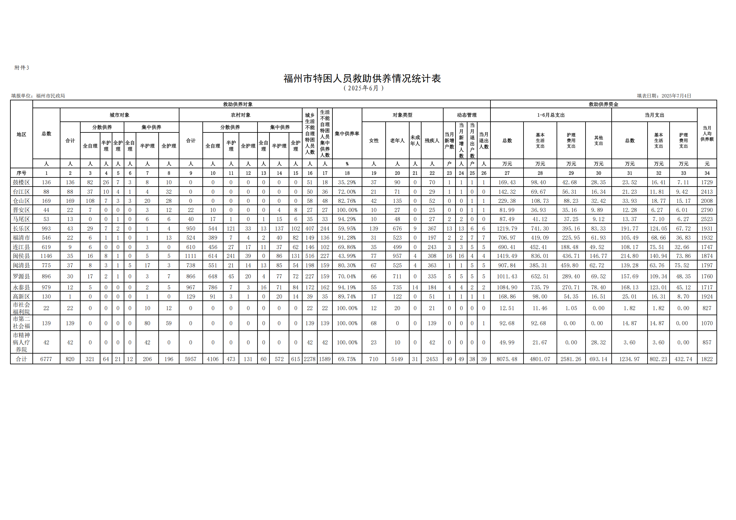 2025-6福州特困人员救助供养情况统计表