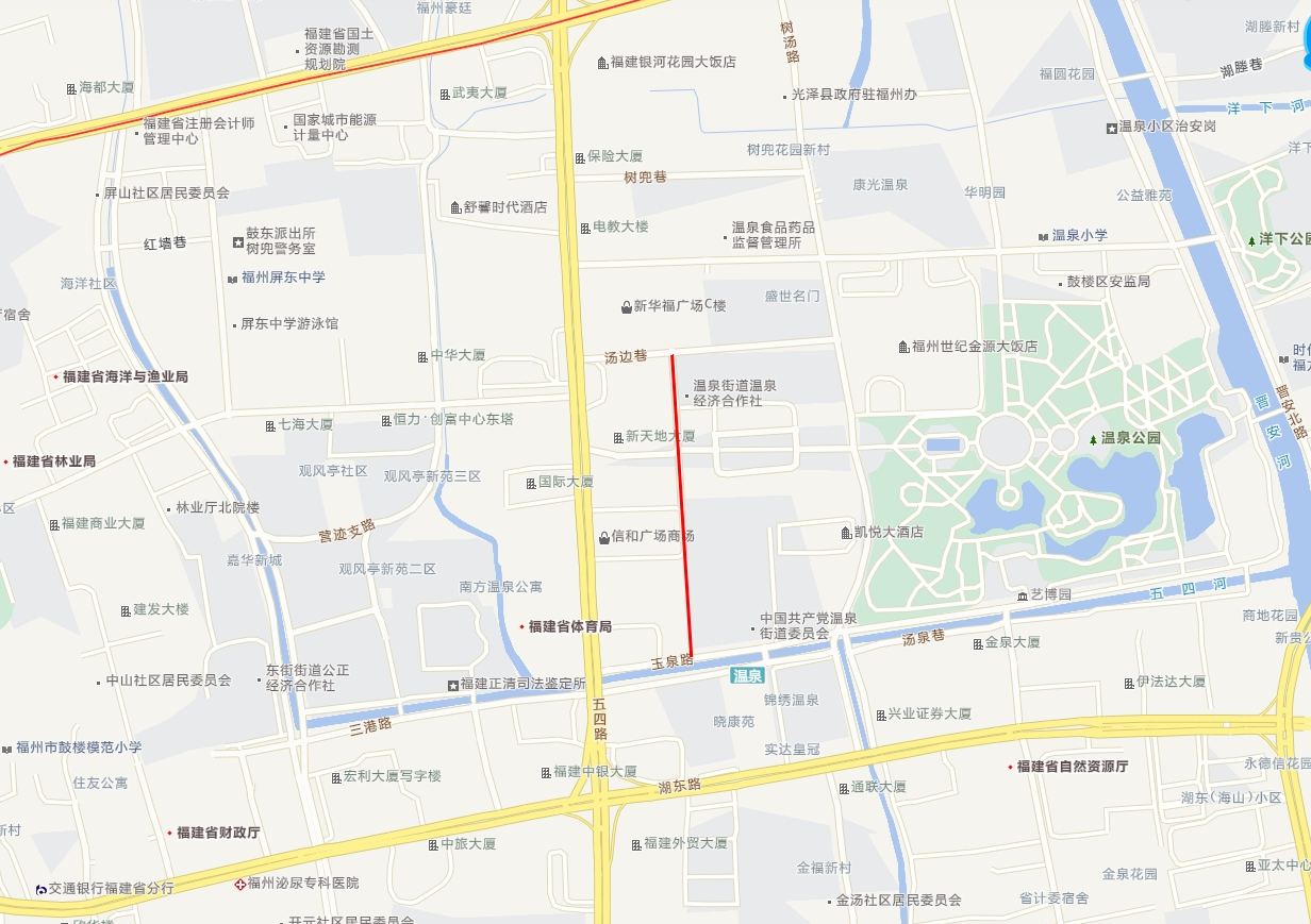 4.东汤巷((Dōngtāng Xiànɡ,变更起讫点):长368米,宽7米。北起汤边巷,南至玉泉路。