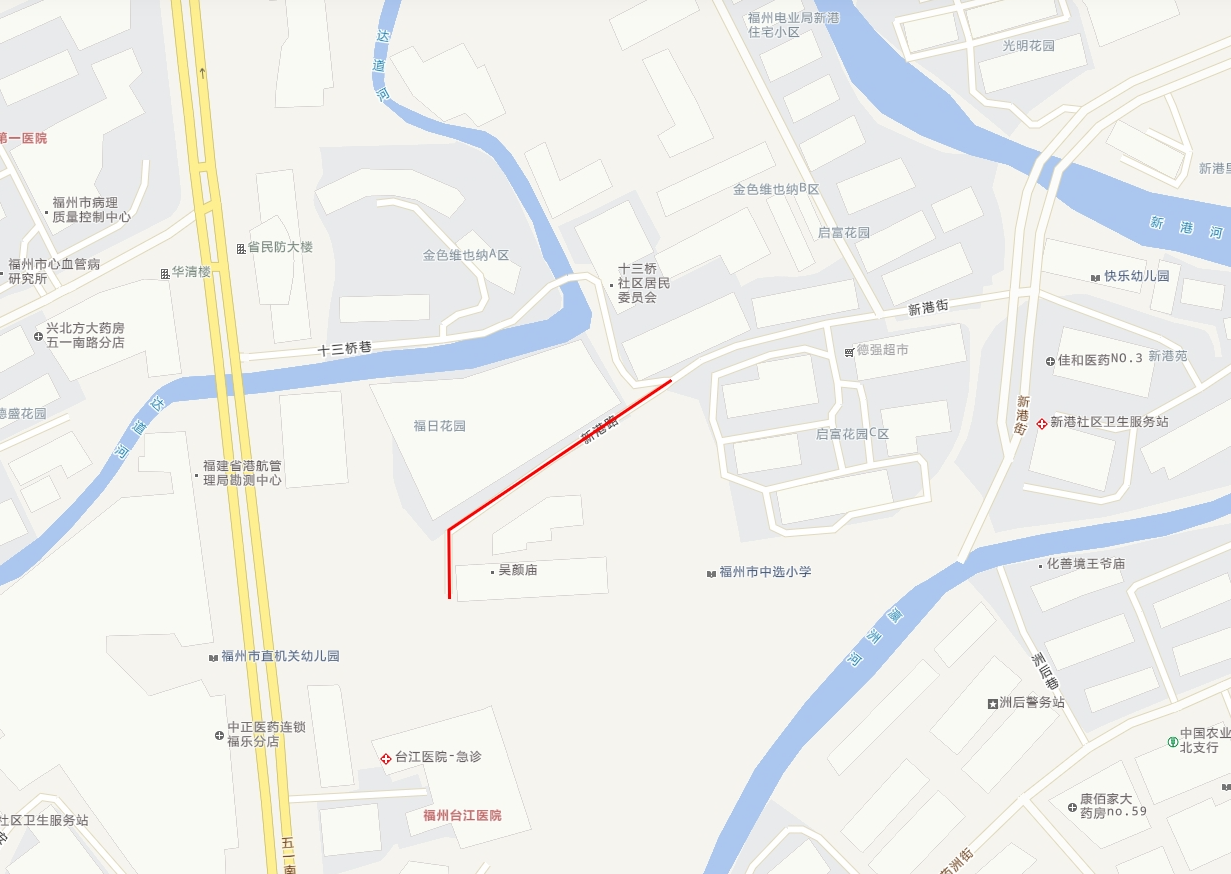11.红星巷(Hōngxīng Xiànɡ,更名):长320米,宽8米。东起瀛江路,向西折向南至瀛福路。因城市建设,瀛东路被分为数段,此段所处位置原为红星村,故更名为“红星巷”。