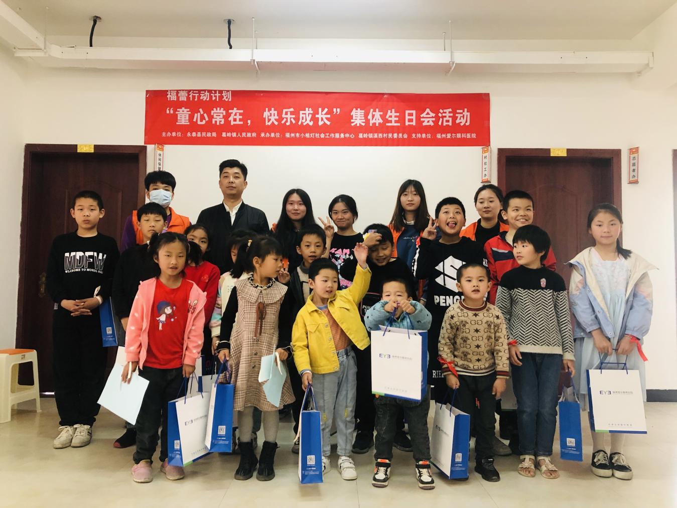 2021年4月10日,在福州爱尔眼科医院的倾情支持下,在永泰县葛岭镇溪西村开展“童心常在,快乐成长”集体生日会活动。通过丰富多彩的互动,把祝福送给孩子们,让他们借助集体生日会的平台,结交到更多的朋友一起成长,给孩子们留下一个难忘美好的回忆。