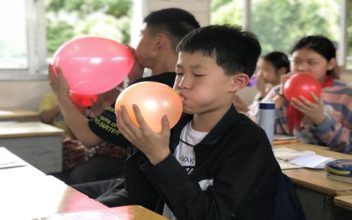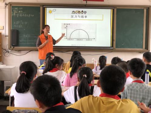 通过一分钟吹气球活动,观察气球的变化过程,社工姐姐引出了压力与学习效率曲线图,告诉同学们适当的压力有利于学习效率的提升,然而过度的压力会导致学习效率低下,要正视压力。